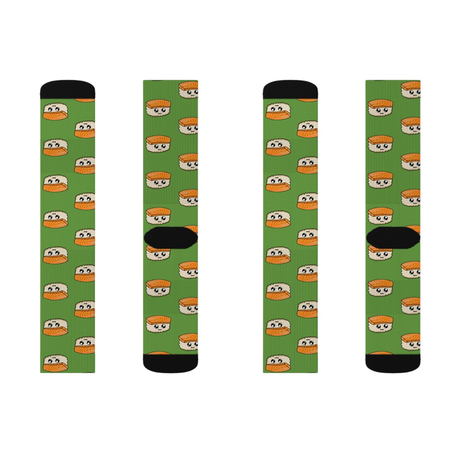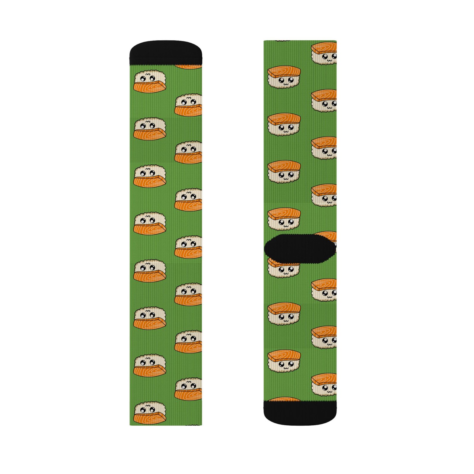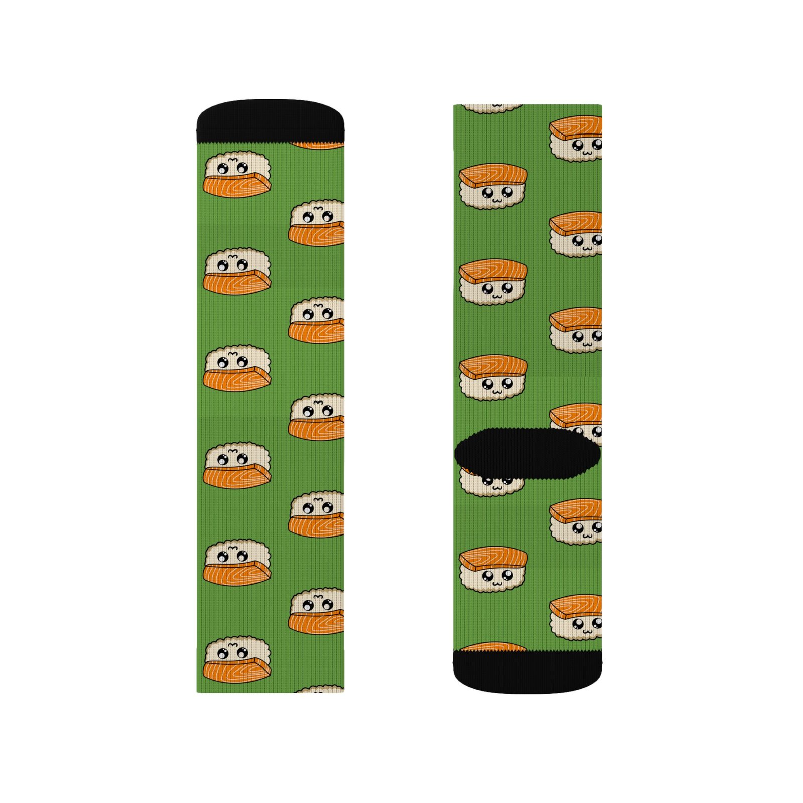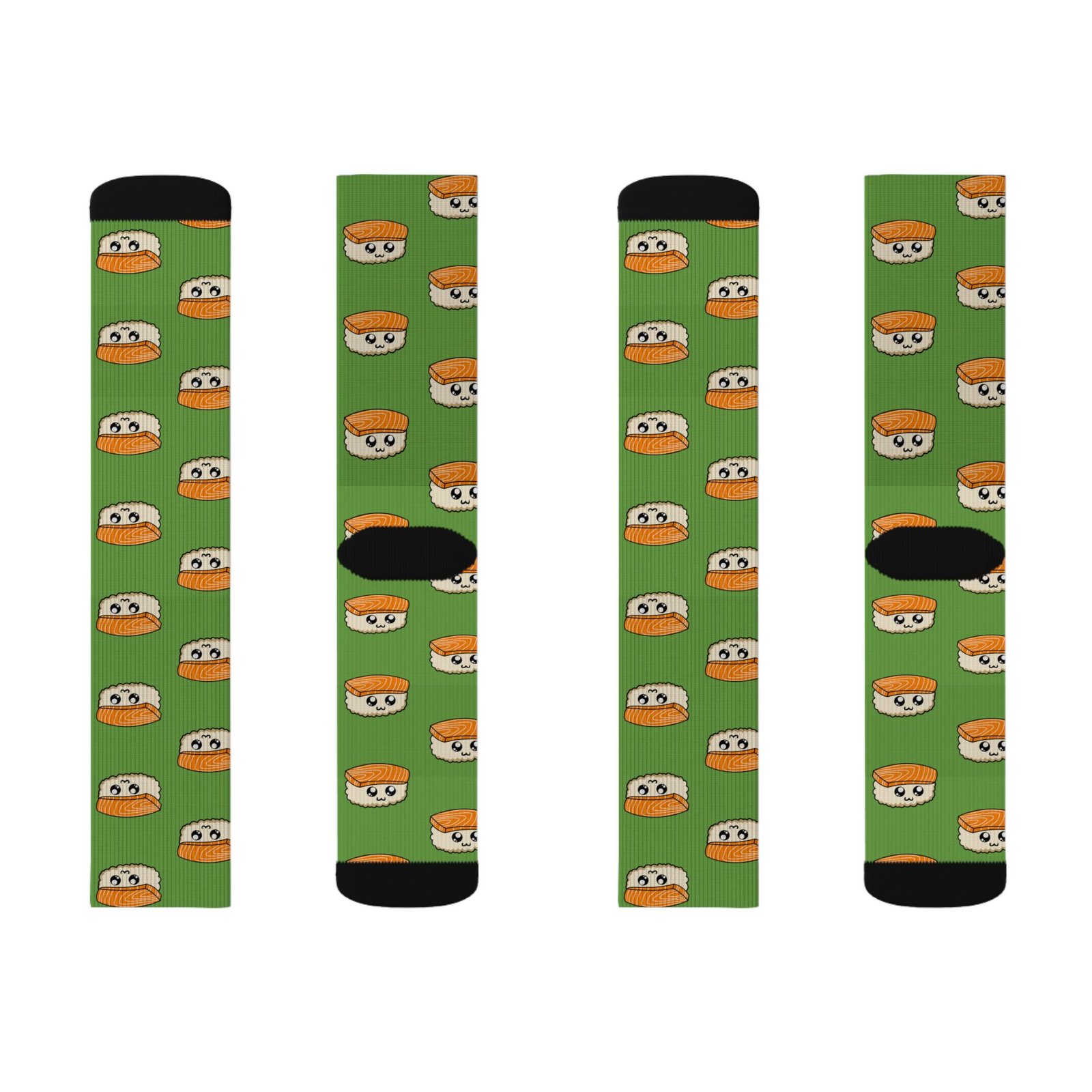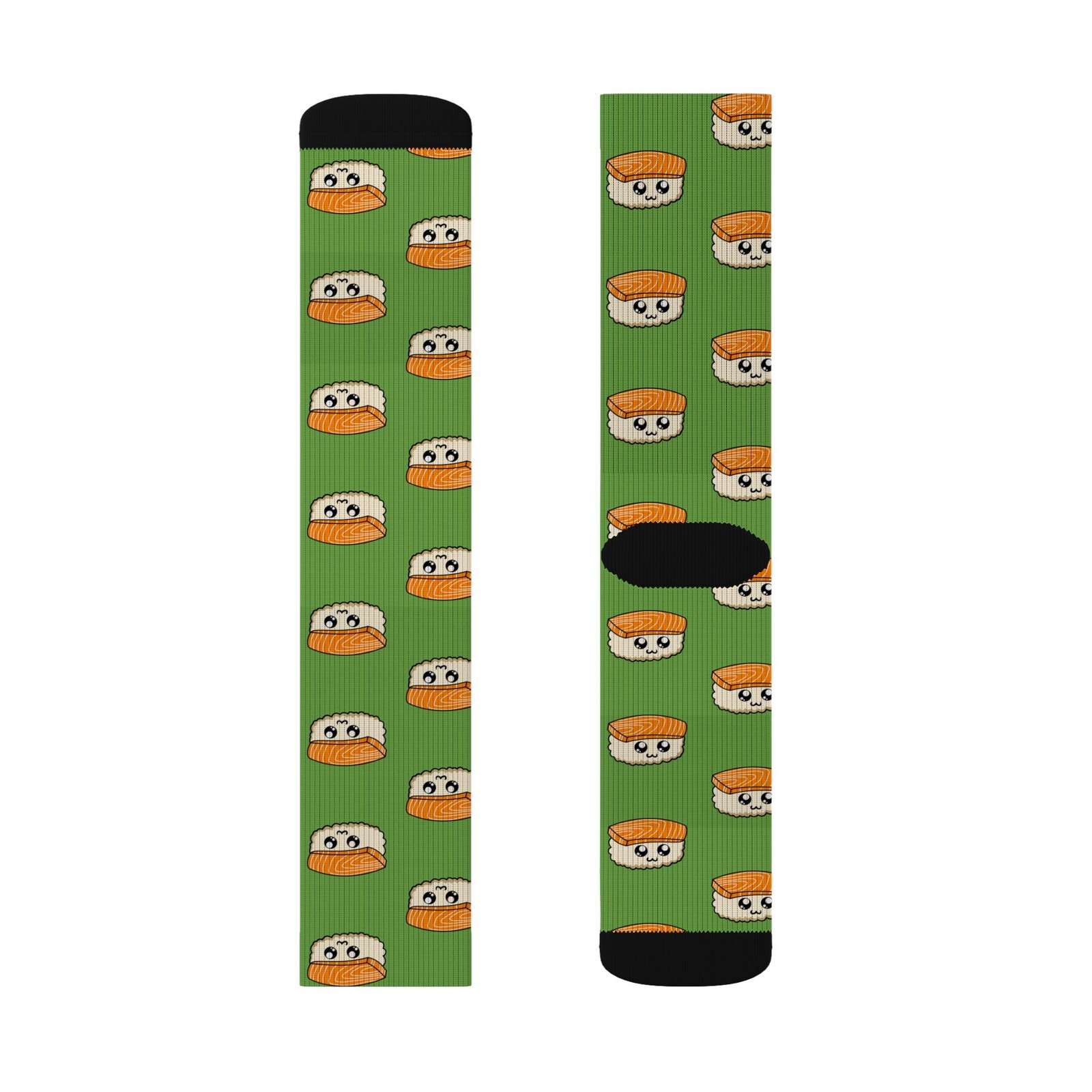 These crew-length sublimation socks bring a bright, playful vibe to everyday wear. The all-over print shows a repeated sushi illustration on a fresh green background, so each step feels a little more fun. Soft fleece lines the foot for cozy warmth, while cushioned bottoms and a ribbed tube give gentle support through long days on your feet. Lightweight stretch keeps the fit snug without squeezing, and the flat sublimation print delivers vibrant color across the whole sock surface. Small color shifts may appear at side seams due to the printing method.